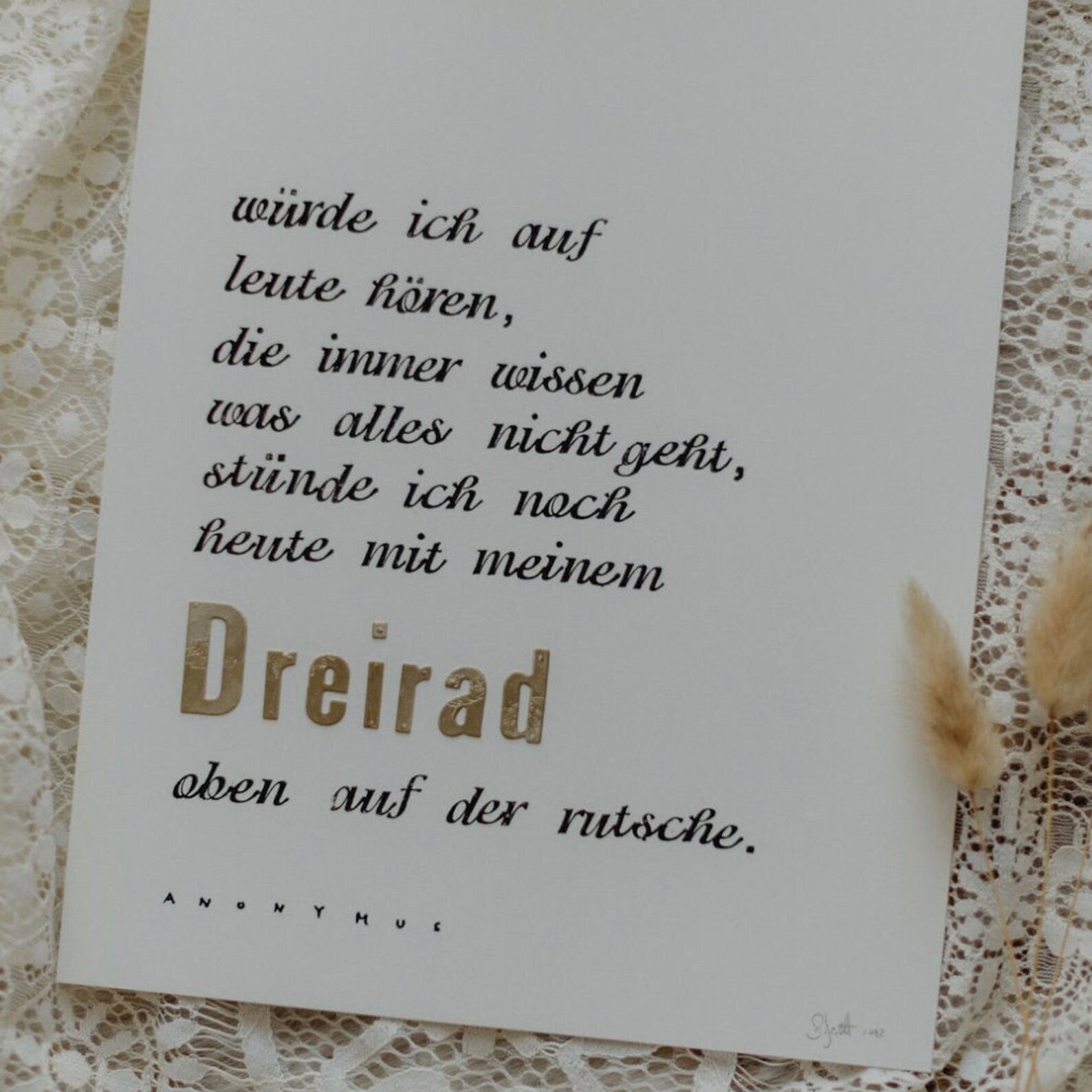 Dieses DIN A4 Bild ist von Hand selbst gestempelt und digitalisiert. Das Wort "Dreirad" ist aus goldenem Karton gestanzt und auf das Bild geklebt. Daher ist jedes Bild ein Original, jedoch OHNE RAHMEN zu erwerben.