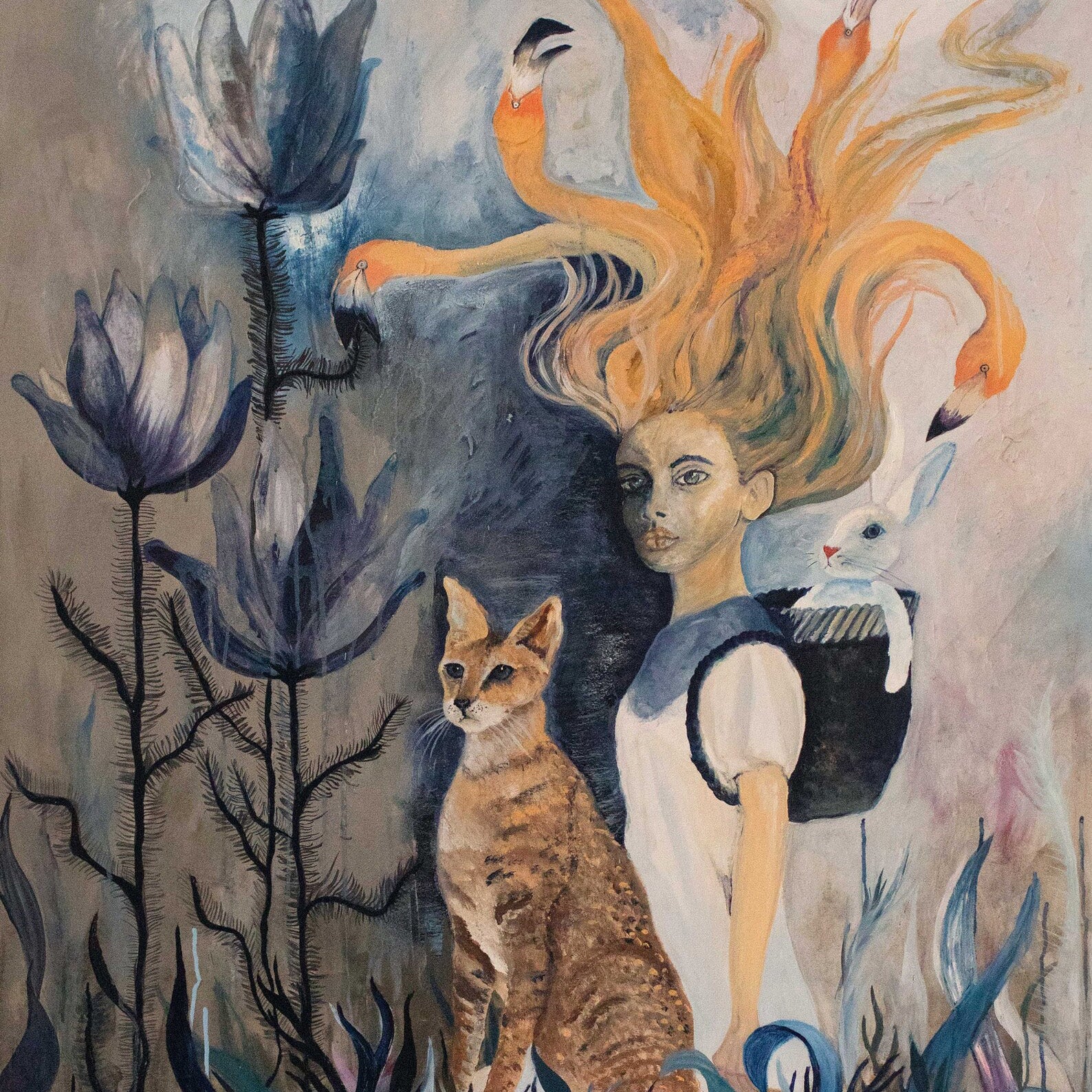 Dieses Bild habe ich mit Öl auf Leinwand gemalt und ist im Original 90 cm x 120 cm groß. Es zeigt ein Mädchen, dass mit dem Angsthasen im Gepäck mutig ihren Weg geht und viele Begleiter bei sich hat. Die Katze wird von kleinen Männchen unter ihr getragen und die Flamingos in den Haaren des Mädchens beten den Mond an. Dieses Bild habe ich in vielen Stunden und Pinselstrichen gemalt und ist ein echtes Herzensbild. Es steht auch noch im Original zum Verkauf zur Verfügung. Bei Interesse schreibe mich bitte einfach an.